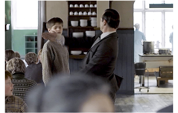 院長は、食堂の入口まで来ると、「お早う諸君」と大声で言う。少年たちは全員立ち上がり、直立不動の姿勢で「お早うございます、ヒック院長」と斉唱する。院長はリリアン先生を紹介した後、「ほとんどの少年は、初等教育レベルだ。奇跡は要求しない。彼らに期待するのは、道路標識が読め、作業マニュアルや、簡単なテキストを読めることだ」と言った後、教室に案内しようとするが、「新入りには何をさせましょう」と寄って来た教師レッスンに、「何ができるかによる。どこにいる?」と訊く。レッスンはエリックとエルマの前に行くと、「立て。院長先生がお話になる」と命じる。「お早う。君たちの名前は?」。「エリック」。「エルマ」。「エルマ、大きくなったら、何になりたい?」。嬉しそうに「宇宙飛行士です」とエルマは答える(1枚目の写真)。少年たちから笑い声が上がり、同時に、レッスンがエルマの頬を引っぱたく(2枚目の写真)。「真っ直ぐ立たんか。生意気はためにならんぞ」。エルマは、頬を押さえながら、なぜ叩かれたのか、宇宙飛行士になる夢がなぜ「生意気」なのか分からず戸惑う。院長は、「初めは、野外で石を土手まで運ばせることにしよう」とレッスンに言う。それを聞いたエリックは、「弟には できません。エルマは内反足なので、重い物を運ぶと痛むんです」と訴える(3枚目の写真)。院長はエリックを見てニヤリとすると、「お前たちは、野外作業だ。それで、エルマが男かどうか分かるだろう」。この男には「内反足」が何たるかが、全く分かっていない。自分の命令だけが第一なのだ。院長が去ると、レッスンがすかさず強烈な一発をエリックにお見舞いし(4枚目の写真)、「これからは、院長から訊かれた時だけ話せ」と命じる。このシーンで、この孤児院の非人間的な性格がストレートに理解できる。観ていて腹立たしいが、実に洗練された脚本だ。この後、教室にリリアンを案内した院長が、先ほど見せた体罰に対し語るのが、解説で引用した「規律の必要性について、きちんと理解してもらいたい。今年から、殴打が廃止されたことは知ってますな? だが、グッビャの使命は、コペンハーゲンの軽率な発想より、ずっと重要だ。少年たちは、誰も管理できなくなったから、ここにいる。どのグッビャの少年も、まともな労働者になれる。それを助けるのが 我々の義務。ビンタは、彼らが理解できる唯一の言語なのだ」という言葉だ。