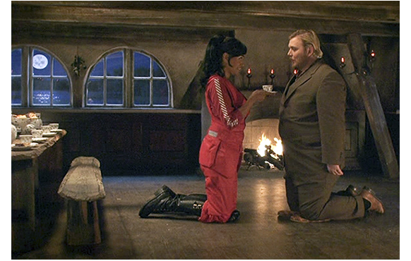 「天井が低いんだね?」とケル。「私たち、昔は小さかったの」。ユニークな設定だ。ケルに紅茶を出して、「乾杯。私は、白雪」。「それ、あなたの名前?」とケル。「2人で何してるの?」。「妹を探してる。翼が切られちゃう」。「翼があるの?」。「そうだよ」。「飛べるの?」。「うん、一度だけど」。そして、車はすぐ直ると言われ、外に見に行く。白雪と2人だけになったエルフは、天井が低いので、膝を付いたまま紅茶を飲むよう勧められる。必ず割ってしまうからと断るのだが、なぜか割れないい。幸運を呼んでくれた女性にエルフに一目惚れする。