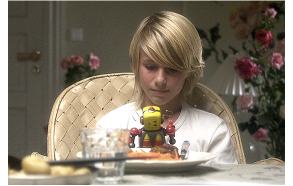 しかし、家に戻って、両親の前で飛行を再現しようとした時、自転車に付けた棒が外れ、リッレの“翼”が車輪に触れて傷付いてしまう。「ケル、二度しないと約束しなさい。危険すぎる」と父。「でも、ほんとだよ。飛べるんだ」とケル。「リッレが飛べるとは思えない」「この子の“翼”をどうするか、そろそろ考えないと」。「どうかしてる。飛べるのに。見たんだ」と食い下がるケル。クローズアップの表情がいい。そこに、チャイムが鳴り、市民局の変なおばさんがやって来る。ずかずかと入ってきて勝手に座ると「お子さん、変わってるでしょ。だから、支援と指導に来ました」。憮然とした表情のケル。この女性、形成センターへの入院を強く勧めて帰っていく。しかし、悪いことは重なるもので、ケルの留守中、リッレがバラの植わった植木鉢を倒して病院へ。そこで強く切除を勧められて、承諾してしまう。