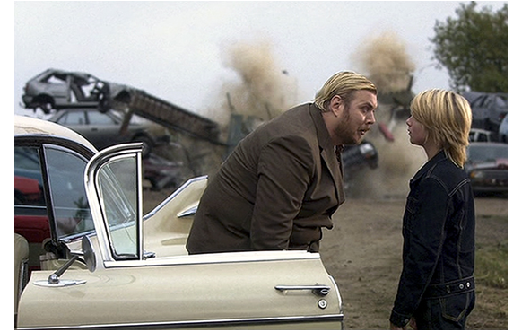 亡き父の大事なキャデラック・デ・ヴィルが盗まれたとあって、20年間怖くて一度も家から出なかったエルフも必死で追いかける。「止まれ! このキチガイ! 車を、めちゃくちゃにする気か?!」と言って、エンジンを止め、ケルを車から引きずり出す。そして、永久にこの家からは離れんと怒鳴っている最中に、なぜかクレーンで吊っていた車が落ちてきて家がペチャンコに。この映画は、あり得ないことだらけなので、ここで「なぜ」と思ってはいけない。とにかく、住む家がなくなったエルフは、しぶしぶケルの頼みを聞いて車に乗せてくれる。