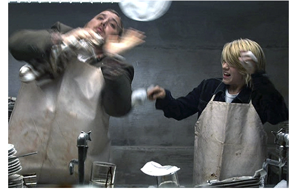 ガス欠でエンストしたら、ちょうどあったにがGS付きパンケーキ屋さん。大好物なのでどうしても食べさせろというので、時間を気にしながら付き合うケル。しかし、3枚目でキレて席を立ち、エルフも車の中で食べようと付いてくる。ところが、2人ともお金を持っていない。そこで、皿洗いをさせられることに。だが、手にしたものは何でも壊してしまうエルフは、片っ端から皿を割っていく(何と163枚も!)。その時、ケルの頭に妙案が浮かぶ。エルフにドアを触らせたらドアが壊れてくれるのではと考えたのだ。これは大正解。ドアだけなく、壁まで崩れてしまった。