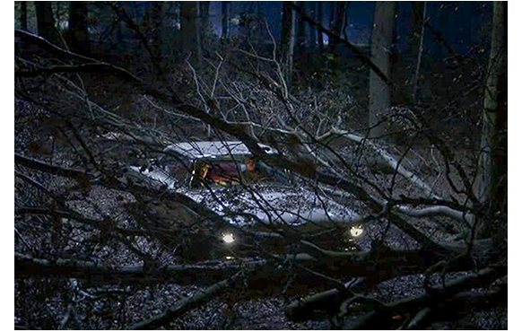 仲良く話しながら車は順調に進んでいく。しかし、右折して野道に入った途端、ロボットが「暴風警報!」と言い出す。「嵐だ? どこに? 窓の外を見ろ。新しい電池が、要るんじゃないか?」とエルフ。しかし、みるみる天候は悪化し、車の前後左右に木が倒れ、身動きできなくなってしまう。そこに登場したのが、「白雪姫と7人のこびと」と大人バージョン。車ごと救出して小屋まで連れて行ってくれる。