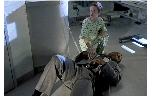 地下に向かうエレベーターの中で、マッケイブはマットに「撃つつもりはなかった。主張を通すためだ」と弁解する。「僕をどうするつもり?」。「決めてない」。「どうでもいいよ。どうせ死ぬんだ」(1枚目の写真)。「パパさんは、そう考えてないぞ」。「直面できないのさ」。これには、さすがのマッケイブも言葉がない。エレベーターが下に着くと、マッケイブは中に棚を入れて、移動できないようにする。そして、死体安置ブースの前を、マットを引っ張って歩く。「気分は?」の問いに、引っ張られる手を振り払い、「どう思う、アインシュタイン?」と噛み付くマット(2枚目の写真)。解剖室の一角に、蒸気配管の通路への隠された入口はあった。煉瓦壁の前に置かれたロッカーを全力でどけながら、マッケイブはマットに話しかける。「パパさんの、癌への思いは正しい。あきらめて死ぬなんて思うな。闘うんだ。闘い続けろ」。「何のために? ずっと病気でいろっていうの? 閉じ籠められて、友達とも遊べない。楽しいこともないのに、何の意味があるの?」(3枚目の写真)。映画の中で、一番重い言葉だ。