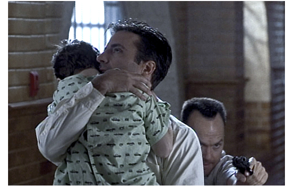 そこに、電話がかかってくる。マッケイブからだ。「あれから考えたんだが、俺をマットに会わせたらどうだ?」。「会わせる? 何のために?」。「もし、そんなに面倒なら…」。そう言われれば、行くしかない。マットを同行して、再びマッケイブを訪れる刑事。この時までに、マッケイブは、病院脱走のためのプランを練り上げ、刑事に何を要求するかを決めていた。脱走すれば、当然移植はできない。最初からマットを助ける気などないのだ。そういう目で、マットとマッケイブ、マッケイブと刑事の会話を見ると、マッケイブの偽善性がよく分かる。まず、マットと2人だけで会ったマッケイブが声をかける。「やあマット、ピート・マッケイブだ。9歳とかいったな。それって、4年生ってことか?」。「はい」。「学校は好きか? 俺は、ヘドが出るほど嫌いだった」。「好きです」。「敬語はやめろ。ただのピートでいい。ピートおじさんだ」。「おじさんじゃないよ」(1枚目の写真)。「やってやる」。「何をですか?」。「お前に骨髄を移植してやる」。そこの言葉を聞いて、「パパ、やってくれるって!」と父に喜んで抱きつくマット(2枚目の写真)。静から動へ、マットの喜びの大きさが分かるが、移植する気もないのに、それを見ているマッケイブの残忍さが怖い。そして、マッケイブは父と「商談」に入る。「骨髄をやるのは、俺のために 幾つかやってくれた時だけだ」(3枚目の写真)。そして、条件を突きつける。所長と交渉して、「喫煙の特権を回復させろ。図書室への出入りを復権させろ。コーヒーには砂糖4個を認めさせろ。そして、俺を独房から出して一般囚に戻せ」。一見、何の変哲もない要求に見える。コーヒー云々は、それらしく思わせるためのダミーだ。