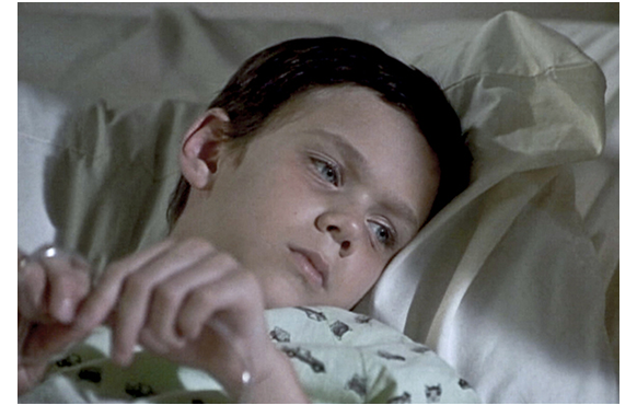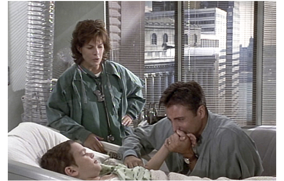 最初の部分は少し長くなる。冒頭、2人のサンフランシスコ市警の刑事がFBIの支部を訪れ、違法にコンピュータにアクセスする。2人のうちの1人フランクが、「テレビで援助を頼んで時間を無駄にするより、6週間前 これをやってりゃよかった」と言うが、見つかれば厳罰も覚悟の違法行為だ。そして、コンピュータは、たった1人だけ適合者を示した。その名は、ピーター・マッケイブ。喜んだのも束の間、その犯罪歴を見て2人は愕然とする。「2人を殺人:仮釈放なしの終身刑」「第1級殺人:懲役30年の終身刑」「加重暴行:禁固1年」「脱獄未遂:禁固3年追加」…。署に帰って調べると、「同房者の足を折って1年間の独房入り処分中」「中学しか卒業していないが、IQは150以上」「2度目の脱獄時には2人の看守を人質にし、生き埋めにして制服とIDを奪う」などの凶暴性が明らかになる。警部はやめるよう勧めるが、ずっと前に妻を亡くし、愛する一人息子の白血病が再発し、移植する骨髄の適合者はマッケイブしかいない。フランクは、刑務所に出向きマッケイブと面会し、「君が最後の望みだ。息子の命を助けてくれ」と訴えるが、「ムショにずっと閉じ込められた後で、また殺す機会ができたんだ。しかも、デカのガキをな。ここにじっとしてるだけでいい」と冷酷な返事。がっかりして、息子マットの様子を見に行く刑事。「体調はどう?」(1枚目の写真)。「あんまり」。マットは、本をプレゼントされて喜ぶが、ついつい訊いてしまう。「再発したんでしょ?」。「ああ」。最悪の事態を覚悟した無表情な顔だ(2枚目の写真)。「骨髄移植のドナーを見つけた」。これで、少し表情に活気が戻る。「ほんと? 適合するの?」。「ああ、でも迷ってる」。「嫌がってるんだ。それに、もしOKになっても、僕の体が移植に拒否反応を示すかもしれない。だから、知ってて欲しいんだ、それでもいいって。パパ、頑張ってくれたから」(3枚目の写真)。何ともけなげな少年だ。