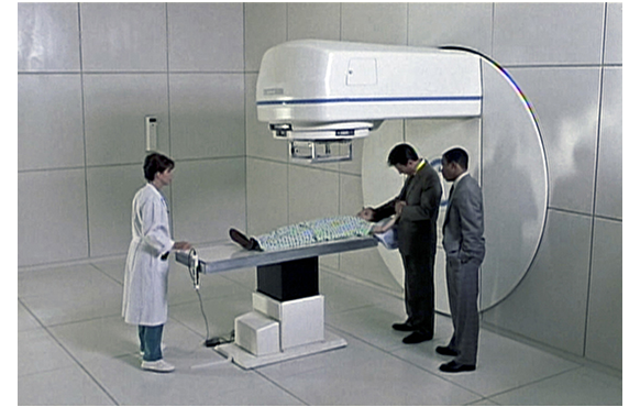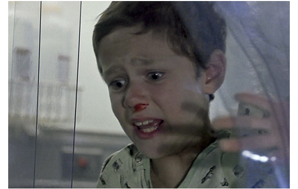 病院では、骨髄移植のための全身放射線照射の準備に入っている。1枚目の写真は、装置の上に横になったマット。マーシャ・ゲイ・ハーデン演じるホーキンス医師が、「マット、1時間くらいかかるけど、始めていい?」と訊く。「どうぞ」。「リラックスしなさい。大丈夫だから」。父は、マットの顔を両手で挟んで「相棒、頑張るんだぞ、いいな? ずっと一緒だ」(2枚目の写真)と勇気づける。「分かってるよ、パパ」。全身放射線照射を行うのは、白血病細胞を死滅させるためだが、その副作用として免疫力が大幅に低下し感染症などにかかりやすくなるため(感染すると数時間で死亡する可能性大)、処置後は無菌室に入るのが必須条件となる。ここが映画の1つのポイント。
