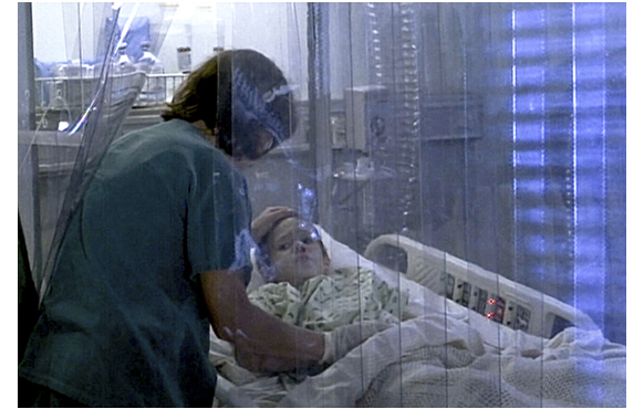 マットに付き添っていたネイトから、鼻血が出ているとの情報を受け取ったホーキンス医師は、さっそく無菌室を訪れ、血小板を取りに行こうとする。その時、ネイトの背後からマッケイブが接近し、銃で頭を殴って昏倒させる。それを見て、「ネイト!」と、思わず無菌室のカーテンを開けるマット(1枚目の写真)。マッケイブは、「来るんだ、先生、あんたが要る」。「マットには私が要る」。「俺の方が要るんだ」。仕方なく医師は、外に出ようとするマットに、「中に入っていなさい」と命じる。マット:「なぜ、殴ったのさ。みんなが、あんたのこと ろくでなしって言ってたけど、よく分かったよ」。マッケイブ:「他にやり様がなかったのさ。いいか、先生はちょっと借りるだけだ、すぐ返す」。「ダメだよ、ここにいて欲しい」(2枚目の写真)。医師:「大丈夫よ。鼻をつまんでなさい。出ちゃダメよ。すぐに戻って来るから」。部屋から出たマッケイブは、医師にシクロプロパン(麻酔ガス)のボンベの保管場所に案内させる。シクロプロパンには爆発性があり、マッケイブの目的は、麻酔ではなく爆発の方。結果的には、新館と旧館を結ぶ連絡橋の爆破に使われる。