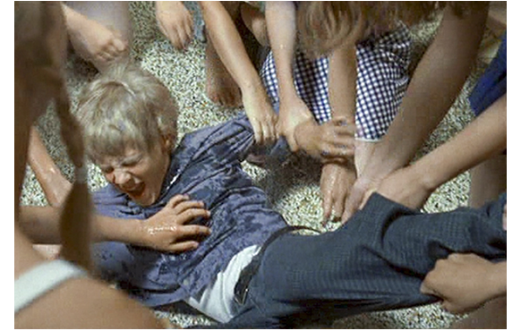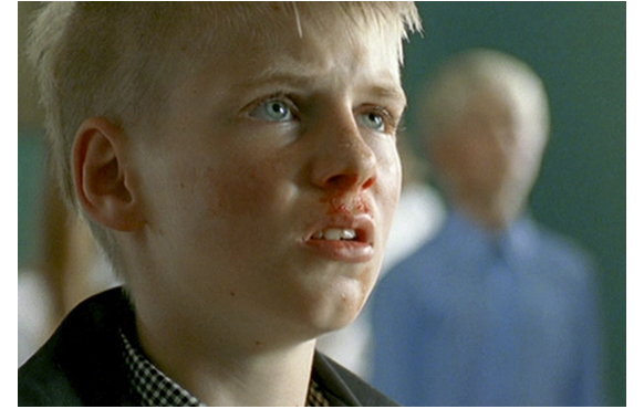幸せなシーンはここで終わり。翌朝フリッツが遅刻して登校すると、廊下でばったり新任の見習い教師スヴェールに会う。先生は「誰にも会っとらんだろ。急いで」と見逃してくれる。中では体操服の生徒が動きまわっている。その中から3人が寄ってくると、親しげに「来いよ」と誘う。そして、物置き部屋の壁の一部を外して一緒に中に入ると、「そっと行って、隙間から見てみろ。口はきくな」「こんな機会は、二度とないぞ」と言う。何本もある鉄の棒をかいくぐって先端の隙間まで行くと、そこから見えたのは女子生徒の更衣室だった。後ろでほくそ笑む3人。見とれていると、指笛の音とともに、フリッツがいるボックスごと更衣室に一気に押し出された。実はロッカーの裏に入っていたのだ。悪ガキは、「安心しろ。お前が男か、確かめるだけさ」と怒鳴ったが、事態は安心どころではなかった。女の子に床に転がされ、水をかけられ、ズボンを脱がされかける。フリッツが必死で更衣室を逃げ出しところで、校長に捕まり、耳を痛いほど引っ張られたまま校長室に連行。次にフリッツが発見されたのはトイレだった。スヴェール先生がこじ開けると、そこでは血まみれになったフリッツが泣いていた〔以下、連続写真〕。