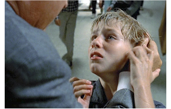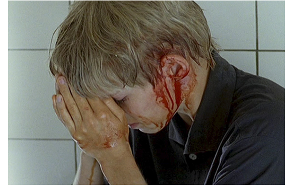 スヴェールは、フリッツを急いで病院に連れていく。ケガを診た医者は、「校長がやったのなら、これは、一線を越えた行為だ」と言う。「可哀想に。耳が上下で引き裂かれている。縫合しないと。左の頬も腫れ上がっている」。そこへ母も駆けつけ、手術後、車で家に連れて帰る。家に着くとフリッツは車を飛び出し、大好きな森へ走っていく。しばらく気を静めていると父の声が聞こえる。父が退院したのだ。抱き合って喜ぶフリッツだが、「耳を裂かれた日の父の帰宅」は、後で深刻な問題に発展していく。