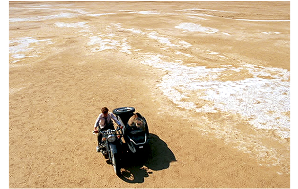 ザンとドゥーマが、この後で、200-300キロは離れた農園までどうやって戻ったか、全く説明がない。チーターと一緒では、なかなか難しいと思うのだが。それはさて置き、農園に戻ったザンは、母に置手紙を残し、父のサイドカー付きオートバイで北西へと向かう。ボツワナ(隣の国)の中部まで上がったところで、ここも不明瞭なのだが、わざわざ道路から離れてマクガディクガディー塩湖を走り始める。干上がった塩湖なので真っ平らだ。最初は快調だったが、かなり進んだところで突然ガス欠。オートバイを押して、軽飛行機の残骸まで辿り着き、夜を過ごす。