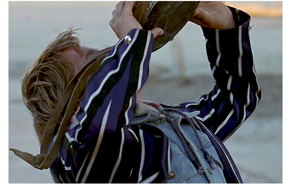 ザンが寝ていると、オートバイのエンジンをかけようとする音が聴こえる。荷物を山ほど背負った黒人がバイクを動かそうとしていた。怒鳴ってやめさせ、ドゥーマが顔を見せて相手がビビッたところで、ザンが「水、持ってる?」と訊く。「かもな」「お前はどうなんだ?」。「バイクがある」「乗せてあげてもいいよ」とザン。「喉が渇いたのか?」と訊かれ、水筒の水をゴクゴクと飲む。その後で、「動くんだろうな?」と黒人。「ガソリンがあれば」とザン。この返事に、してやられたと苦笑し、自分はリプクーナだと名乗る。「僕はザン、水をありがとう」。水のある所まで歩くと5日かかるという話に、ザンは考え込む。工作は得意なのだ。オートバイに木でマストを立て、車体から離れた所にタイヤを1本付けて、砂上ヨットを作る。真っ平らなので、風を受けて滑るように走行。リプクーナも感心することしきり。