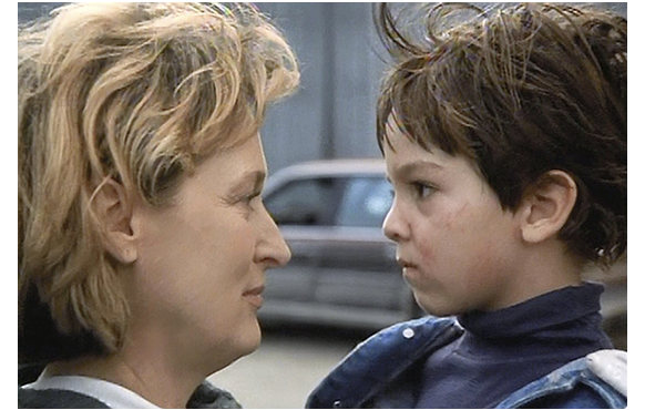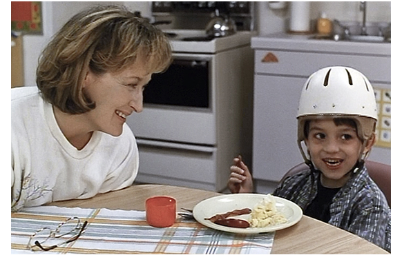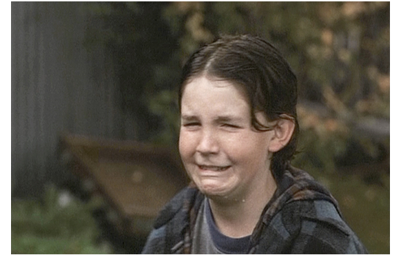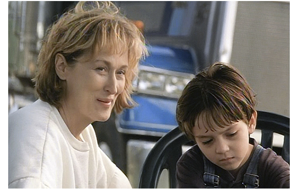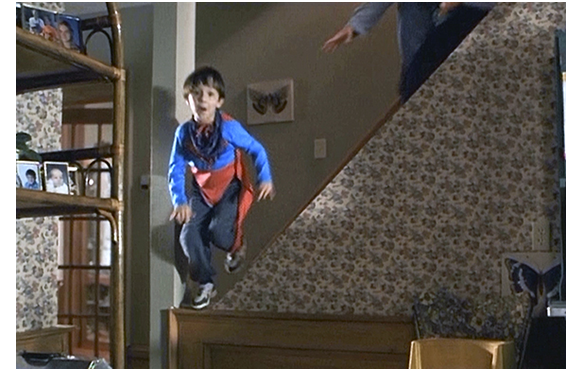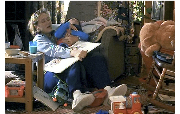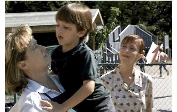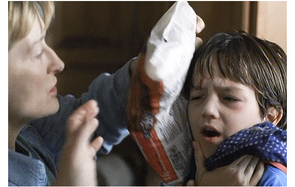ロビーの一家は、農場のような所で暮らしているが、父はトラックの運転手で、決して暮らしは裕福ではない。だから、母は雑貨屋でパートで働いている。そこに、ロビーの幼稚園から連絡があり、①転んだ(tumble)、②今は何ともない、③見に来て欲しい(check it out)と伝えられる。母が、幼稚園に行ってみると、「来ていただき恐縮ですが、倒れ方が変だったので。おやつのトレーを持っていた時、崩れるように倒れたんです。でも、すぐに立ち上がり、その後は元気でした」と説明を受ける。母は、「ねえ、なぜ倒れたの?」と抱き上げるが、「倒れてないよ」と言うだけだ(写真)。これが、ロビーの最初の癲癇発作だった。