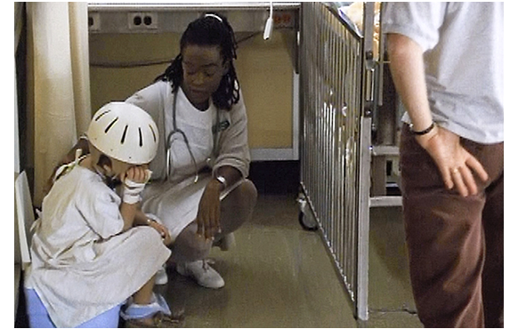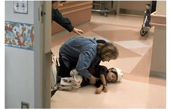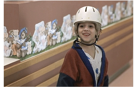 翌日、ロビーは久し振りにまとも。転倒防止用のヘルメットは着用しているものの、至って元気だ(1枚目の写真)。しかし、次の瞬間には、床に崩れるように倒れてしまう(2枚目の写真)。問題は他にもあった。昨日ブラウン医師が約束した、専門医のスタンフィールド医師がちっとも現れない。しかも、看護婦が病室に入って来て、ロビーに「明日、退院なのね?」と笑顔で話しかける。そんな話に初耳の母は、驚いて否定するが、看護婦はカルテにそう書いてあると言う。