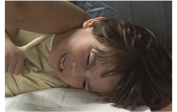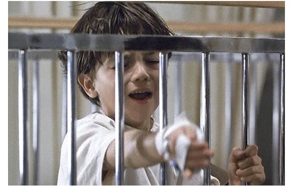 入院後の経過日数も使用薬剤も不明だが、ロビーが簡易便座に座って苦しんでいる(1枚目の写真)。母が看護婦に「なぜ この子が痔に?」と尋ねると、「薬で便秘になり、踏ん張るから痔に」という答え。別な日、夜、父が見舞いに行くと、ロビーはフロア中を走り回っている。母が追っても叫び声を上げて逃げまどい、「来るな!」「あっち行け!」とわめく。やっと捕まえても、もがいて暴れ、父を見て、「出てけ!」(2枚目の写真)。さらに、「放せ、ブタ、嫌いだ!」とも。その言葉に怒った父がロビーをつかんで叱ると、左手で顔にパンチをくらわせ、父の口を切ってしまう。映画では、母が、マイソリンのせいだと言うが、この薬の副作用には眠気、注意力・集中力の低下はあっても、このような症状は書いてない。むしろ、攻撃性(怒りっぽい、興奮しやすい、混乱、取り乱す)の出るレベチラセタムのような薬なのだろうが、レベチラセタムそのものはアメリカで1999年に認可された新薬なので、この映画には間に合わない。ロビーは副作用による異常亢進状態が終わり、強直発作が始まっている(3枚目の写真)。ひどい副作用と発作のくり返しでは、母は休む暇もない。苛酷な毎日だ。鉄柵で囲まれたベッドに入れられたロビーは、両手で柵をガタガタ揺すりながら、「マミー、出して!」と大声で泣き始める(4枚目の写真)。看護婦は自宅で休むうよう勧めるが、母は、院内の廊下で仮眠する。観ていて、一番可哀想な部分。もう限界だと思う。
