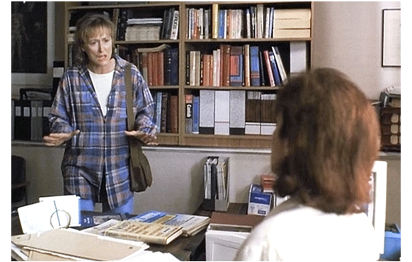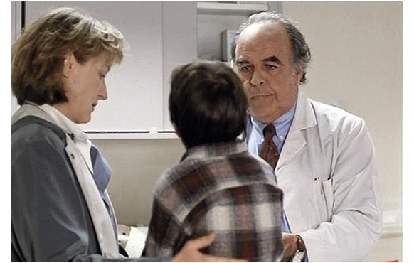 翌朝、母が起きてくると、ロビーの隣のベッドが空いている。実は、隣には、癲癇の薬物療法が効かなくて、脳の手術を受けた少女が寝ていたのだ。直感で亡くなったと悟った母は、すぐにアバサックの部屋に直行する。メリル・ストリープの見せ場だ。「リリーはどこ?」。そこには、アバサックの他に2人の医師がいた。そんなことにはお構いなく、母は続ける。「隣のベッドの小さな女の子。どうなったの? 死んだのね?」。「稀なことだけど、癲癇で死亡したの。手術のせいじゃない」。「この病院、変よ。どこかが、絶対に間違ってる! 息子を助けるために連れて来たのに、重症にしただけ。薬を試し、今度は、副作用を治すため別の薬を与える。そして、また違う薬を試す。そのくり返し。発疹、リンパ腺肥大、発熱、便秘、痔、歯肉の出血。今や、酔っぱらいかゾンビかサイコみたい。それも、病気のせいじゃなく治療のせいよ!」(1枚目の写真)。患者の親がこれほど医師を責めるのは珍しいが、逆に言えば、そのほどアバサックが両親のケアに不親切・不適切だったということだ。この時、ロビーの容態が急変する。激しい癲癇発作が止まらなくなったのだ(2枚目の写真)。駆けつけたアバサックは、ジアゼパム(製品名:ヴァリアムIV)を2mgを静注する。効果がないので発作が止まるまで1mgを順次追加するよう指示〔ジアゼパムの静注は筋痙発作が止まらない時の非常手段〕。効果がないので、「パラアルデヒドを4mg渡して」と言い、看護士が間違えて経口用のプラスチック容器に入れて渡そうとし、容器が溶けてしまう。パラアルデヒドは、中枢神経を抑制する直腸麻酔薬なので、看護士が経口用と間違えるはずがなく、映画のレトリックか? それにパラアルデヒドは、プラスチックと反応する性質はあるが、人体には無害なので、母親が溶けた容器を見て過剰反応するのもレトリック。