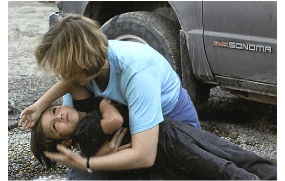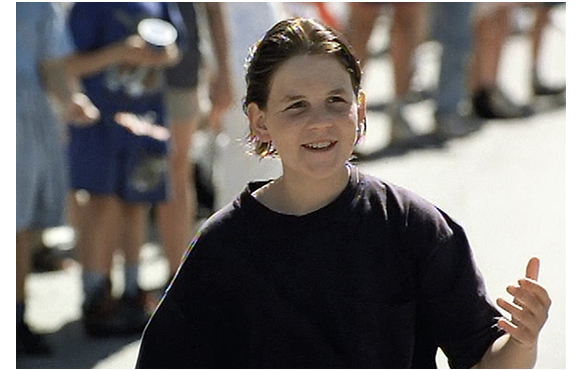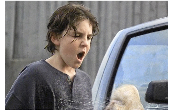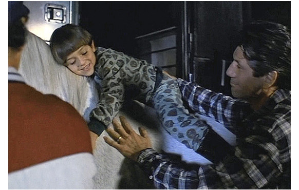 その午後、母は、シュウォーツを小さな柵内でくるくる走らせている。ロビーは木の柵にまたがり、「ママ、シュウォーツに乗りたいよ」と叫ぶ。母は、馴らしている最中なので、「まだ準備ができない」と言うが、ロビーは「ボクは、準備できてるよ」。「調教が終ったら、乗れるわ」。「絶対だよ(Scout's honor)!」。その後、ロビーは、ピックアップトラックを洗車しているマークの手伝いを命じられる。「マーク、ワールド・クラスの洗車助手を行かせるわ」。マークが「やろうか、チビ」と言うと、ロビーは「チビなんて呼ぶな」と反発。悪戯なところもあるマークは、「僕が汚れを取るから、お前は水で流せ。だけど、こんなことはしちゃダメだぞ」と言って、ロビーに、ホースでわざと水をかける。母に注意されたマークは、「ごめん、持ってろ、チビ」と言ってホースを渡すが、ロビーは「またチビって言った!」と、兄にホースを向ける(1・2枚目の写真)。掛かった水は、こちらの方が多い。トラックの反対側に逃げるロビー。「びしょぬれだ。覚悟しろ、倍にして返してやる」とニコニコしながら車の反対側に回ると、そこにはロビーが倒れていた。最初は、「ふざけるのは止めろ」と見ていた兄も、すぐに病的な発作だと気付き、「ママ、ママ、急いで、ロビーがどこか変だ!」と叫ぶ。ロビーは片手を上げ、硬直したような状態で呻いていた(3枚目の写真)。いわゆる「強直発作」だ。