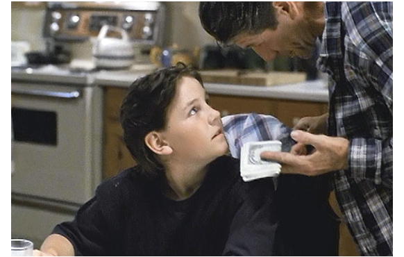 ロビーは、母ロリーに絵本を読んでもらい、ベッドに入る。しかし、外が騒がしい。父のデイヴが賭けポーカーで、町会議員から白い馬を勝ち取ったのだ。2歳の時 脚にケガをして狩猟には使えない馬だが、普通に乗ることはできる。馬が欲しかったロリーには素晴らしいプレゼントだ。ロビーも騒ぎにつられてベッドから起きてきて、「ボク、最初に乗りたい」と父にすがる。そのまま抱き上げられて、パジャマのまま馬に乗せてもらう。「これからシュウォーツだ」。これで、馬の名前が決まった。シュウォーツはロビーの好きな幼稚園の先生の名前。馬の名前にされて可哀想な気も… 馬の背を抱きながら、「シュウォーツは ボクが好きなんだ」と、ロビーは嬉しそう(1枚目の写真)。家族は家に入り、長男のマークが父の手にしたお札を見て、「幾らあるの?」と訊く。父は、「まだ、600ドル足りん」と言いながら札束を見せ(2枚目の写真)、貯金箱代わりのガラス瓶に入れる。マークは、皮肉まじりに、「すごいや、僕の孫をハワイに連れていける」と冗談を言うが、実は、600ドルくらいすぐに貯まると期待している。