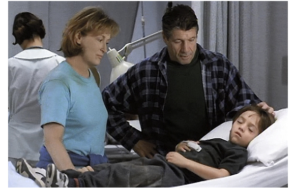 一方、家では、「フォークロージャー」の貼紙が破られている。父は、マークの仕業だと思い(他に誰もいない)、「誰がやったんだ?」と訊く。「知らないよ。僕を悪者にするつもり?」。「フォークロージャーの掲示を剥がすのは犯罪だ。刑務所行きだぞ。だから、二度としないと誓って 元に戻しとくんだ」。「僕に、やったと言わせたいんだろ? ああ、やったさ! なんで僕の あら探しばかりするんだ? 2人とも、全部 僕のせいにする。ロビーが死んだら、それも僕のせいなんだ」。「何だと?」。「あれ、本気じゃなかった。頭に来てたから」。「何の話だ?」。「ママ、話してなかったのか」。「何をだ」。「ごめん。本気じゃなかったんだ。ロビーには死んで欲しくない。弟だもん。大好きだ。あいつを死なせないで。お願いパパ」(1枚目の写真)。改心したマークの泣き顔が感動的だ。再び、病院で。麻酔薬が効いて、ロジャーは意識が朦朧としている。以前はAからZまで早口でくり返していたのに、今は、ノロノロとGまで言って、またAに戻る有様(2枚目の写真)。母は、このまま寝たきりの植物人間になるのではと心配する。一緒に見ている父も辛そうだ。母は切々と語る。「この子、どうなるの? 植物状態になると思う? もし、そうなったら、私、世話できていけるか自信がない。そんな姿を毎日見るのも耐えられない。医者は何も分かってないわ。この先どうなるかすらね。多分… 死ぬかもしれない」。父の方は、仕事に疲れて十分な返答ができないので、妻から、「自分の息子が、元のように幸せにならなくても構わないわけね?」「何て、父親なの?」と責められる(3枚目の写真)。父親役のフレッド・ウォードの出来がいま一つなので、会話に説得力が欠ける。