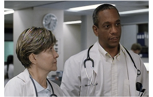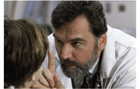 悲惨な状況は続くもので、この直後、ロビーがひどい発作に襲われる。ソファの上で全身をガクガクさせる間代(かんたい)発作を起こし、意識を失い(1枚目の写真)、失禁もする。ロビーは直ちに病院に緊急搬送された。3番目の病院だ。そこに現れたのが、医師アバサック。下三白眼のため、きつい顔立ちだが、後で自分でも、「気安く近づけない(not the easiest person to deal with)タイプ」と称している(2枚目の写真)。アバサックのスタンスは、医師として あるまじきもので、ロビーをとことん不幸に追い詰めていく。アバサックが最初に両親と会った時の会話。「ロビーは、一般の抗痙攣薬に反応していませんね。複数の病因による痙攣の複合が原因です。普通には使わない薬を試してみましょう」。母:「未承認薬のコンパッショネート使用〔患者の救済を目的として、代替療法がない等の限定的状況において未承認薬の使用を認める制度〕はどうでしょう?」。「まだ試すことのできる承認薬があるのに、未承認薬を使用する理由がありません。翌朝、一連の検査をするよう指示しておきます。新しい薬の投薬を始めたら、その後の経過を同じ検査で観察します」。薬漬け状態のロビーに疑問と懸念を抱いていた母は、「必要があるんですか?」と尋ねる。父も、「何度も何度も同じ検査を受けて、息子は参っています。そのくり返しなんです」とフォロー。しかし、アバサックは、冷たい調子で、「この際、きちんと申し上げておきましょう。最初の抗痙攣薬に失敗した場合、薬物療法で治る確率は15%しかなく、あとは手術だけ。簡単に済むと期待してはダメ」と宣告する。この話し合いの間も、ロビーは睡眠状態にもかかわらずミオクロニー発作〔手足の筋肉のどこか一部の収縮〕が起きている(3枚目の写真)。
