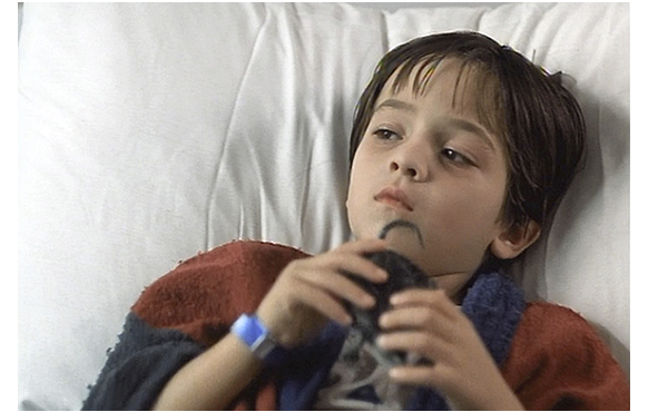 母が、ロビーをシュウォーツの近くに連れて行く。手を伸ばして鼻に触るロビー。「乗ってもいい?」。薬の副作用で、話し方がすごくノロノロしている。「いつかね。約束する」。「絶対だよ」(1枚目の写真)。ロビーの顔に、副作用による発疹が出ている。覇気が全くない。次のシーン。新たな成績表を前に、姉とマークが「ママ、すごく興奮するわよ」「僕が先に言うから」とワクワクしている。成績が上がったのだ。そこに、母がロビーを抱きながら、プリプリしながら帰宅する。外から、電話をかけて用事を頼もうとしても、誰も出なかったからだ。母が苛立っているもう1つの理由は、ロビーの発疹が麻疹でなく、スティーブンス・ジョンソン症候群だったこと(2枚目の写真)。カルバマゼピンの副作用で、38.9℃の熱が出て、体中に水疱ができて苦しんでいる。その時、母はようやく2人のお祝いムードに気付く。「今日って、誰かの誕生日だった?」。「別のお祝い。パパを待ってるの」。母は、電話をかけようとして受話器を取るが、発信音がしない。そして、料金滞納で電話が止められたと気付く。電話会社の営業時間内に支払いに行こうとお金を捜すが、貯金箱代わりのガラス瓶以外に現金はゼロ。瓶からお金を出し始めた母に、マークは「何してるのさ?」とくってかかる。母は、答える余裕などないので、姉が「電話が切られたの。払ってないから」と答える。「バカな借金取りから、朝早く起こされなくて済むじゃないか!」。「あと10分。電話会社に行ってる間、ロビーを見てて」。「そのお金は取っちゃダメだ。ルールだろ!」。姉:「電話は要るわ。911で救急車を呼ぶために」。「それ、旅行のお金だろ!」。マークと母で瓶の奪い合いとなる。「何の旅行?! マーク、弟を見なさい! 旅行なんか、行けると思うの?! 家から追い出されそうなのに、家族休暇?!」。マークは、成績表を取り出し、「そうかい、文法でAを取ったらハワイでダイビングだとパパが言ったから」と言うと、成績表を母に投げつけ、「バカだった」。「ああ、ごめんなさい」。「ロビーなんか生まれなきゃ良かった」。「何てことを!」。「どうせ死ぬんなら、さっさと死なせりゃいいんだ!」(3枚目の写真)。そう叫んで、家を飛び出して行く。