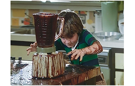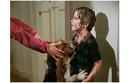 キッチンでは、オーブンが変な音を立てている。ベンが、「切った方がいいと思わない? 爆発しそうだ」とボリスに注意喚起するが、ボリスは、「触るなと言われたろ」と無視。そして、ミキサーにチョコレート・ムースの材料を流し込む。「どうなるの?」。「チョコレートが 卵白とブランディーと混ざる」。ボリスが席を立った瞬間、ベンが、「僕がやる」と言い、蓋をしていないミキサーのスイッチを押す。当然、中身は真上に飛び出し、あたり一面チョココレートだらけ。「スイッチを切れ!」。ベンがスイッチを切る(1枚目の写真)。「このバカ。最初から、やり直しじゃないか」。「ごめん」。その時、オーブンから煙が出始める。「ボリス、見て!」。「分かってるって。ベトベトなんだろ。来い、風呂に入れてやる」。その時、元アナベルが帰宅する。「まあ、サル顔じゃない。汚れた顔も似合うわね。泥のパイでも作ったの?」。ボリス:「ムース・パイです。手違いで破裂して」。「破裂? 冗談でしょ」。ベン:「ママ、七面鳥が」(2枚目の写真)。「チョコの兵隊さんは、洗ってらっしゃい」。元アナベルがようやくキッチンに行くと、室内には真っ白な煙が充満している。窓を開けて煙を出し、オーブンを開けたら、中の七面鳥は黒焦げ状態だった。