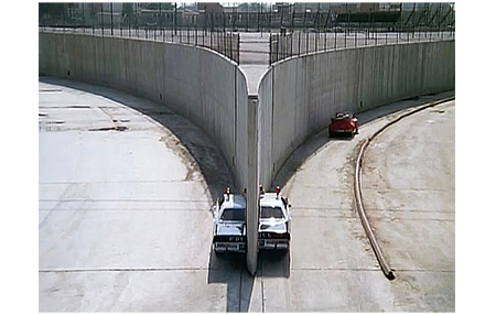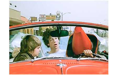 そこに父から、料理を催促する電話がかかってくる。そして、アナベル〔元母〕が、イベントの目玉として、これから水上スキーを披露することも知らされる。アナベルは水上スキーの名手だが、母はそうではない。元アナベルは暴挙を止めようと、テキトーに作った料理〔猫の餌に生麺とタバスコとオリーブの実とパン粉をかけたもの/焦げたローストターキーは、スモークターキーに〕を母の赤い小型車に乗せ、運転を一度もしたことがないのに、緊急事態なので、自分で運転して港に向かう。ここからは、完全にドタバタ喜劇。①最初は、間違えてバックして、隣の家のプールサイドでパーティをしていた人たちを全員プールに落とし、②パトカーを5台乗せたキャリアカーの前に突然割り込んで急停車させ、上の段に乗っていた3台が落下、それを見たパトカーが追跡を開始、③ここで、母とアナベルが再度入れ替わるが、シチュエーションは変わらない→車を運転しているのが本当のアナベルに変わっただけ、④60段の長い階段を降り、⑤道路工事用のコーンを20個跳ね飛ばして、1つが頭に被さり(1枚目の写真)、⑤高速道路の上の人道橋を無理やり渡り(パトカーは幅広で通れないので、コンクリートの高欄上を走る)、⑥コンクリートの排水路に入った後、分岐点にぶつかったパトカーが2つに割れる(2枚目の写真)などの あり得ないアクションで観客を楽しませた後、車は桟橋から海に転落して停まる。母がつかまっているハングライダーは、3人の乗った車の近くまで飛んできて(3枚目の写真)、無事着水。