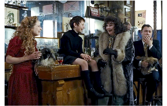 リュシヤンとモデルは、そのままカフェへ移動。このシーンの冒頭も日本版では、一部省略されている。「どこに行くかは 言えないけど、ラブ・レターを書くから。きっと恋に落ちると思うよ」。「何を書くつもり?」。「ボードレールの詩か。僕の詩。違いは 分からないと思う」。「今書いて」。「ダメ。戦争が終わったら 捜しにくる」(1枚目の写真)。「もう おばあさんよ」。「ううん、それでも好きだよ」。「どうかな」。「じゃあ、あなたに似た女性を誘惑する」。これが少年の言葉かと疑ってしまう。そこに、当時、絶大な人気を誇っていた歌手のフレエル(Fréhel)が入ってきて、モデルは思わず息を飲む。リュシヤンの後ろ姿だけ見て、「かわいいお嬢ちゃん」と声をかける歌手。「男の子だよ」と憮然な顔をするリュシヤン。歌手は、「許してね、おチビちゃん」と詫び、「素敵なママね」と言う。これにも、「ママじゃない。モデルさん。僕、画家なんだ」とそっけない(2枚目の写真)。その時、ようやくモデルのびっくりした顔に気付く。「どうしたの?」。「フレエルよ」。相手が誰だが分かって、満面の笑顔になるリュシヤン。歌手は、間違えたお詫びにと、レモネードをおごってくれる。「あなたの歌、一つ知ってます」とリュシヤンが言うと、歌手は、てっきり子供にも人気のある「ラ・ジャヴァ・ブルー(La Java bleue)」のことかと思って歌い始めるが、リュシヤンは「それじゃありません。僕が好きなのは『ラ・ココ(La Coco)』です」と言う(3枚目の写真)。「ココ」とは、フランス語でコカインの意味。それを聞いた歌手は大笑い。「だけど、子供の歌うものじゃないのよ」。「好きになるのに、年齢は関係ありませんから」。そして、リュシヤンは歌い始める。それに合わせ、歌手とモデルが歌い始め、3人で仲良く「ラ・ココ」の第3節を歌う(4枚目の写真)。「♪ジプシーが奏でる 輝くようなタンゴ ♪彼の腕に抱かれる 美しい女 ♪そして私の手には、ナイフがある ♪私の復讐は 残酷なの ♪私は酔うと 愚かなことをする ♪私は情夫を殺した ♪女の目の前で ♪よた者のように 心臓にナイフを突き刺して ♪コカインをちょうだい ♪脳を錯乱させるから」。アパートに戻ったリュシヤンが、「♪コカインをちょうだい ♪脳を錯乱させるから」と上機嫌で歌い始めると、頭に来た母に「何て子なの!」と頭を叩かれる。面白いシーンだ。これが歌詞だと知らなかったら、そして、11歳の息子がこんなことを真面目に言ったら、どんな母親でも激怒するだろう。因みに、「コカインが欲しい」の部分、原曲では「Je veux de la coco(コカインが欲しい)」だが、リュシヤンは何故か「Donnez moi la coco」と歌っている。なお、歌詞の全訳を載せたのは、日本版の訳があまりにお粗末だったから。
