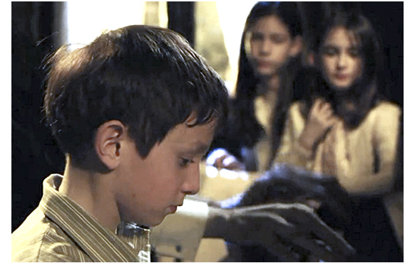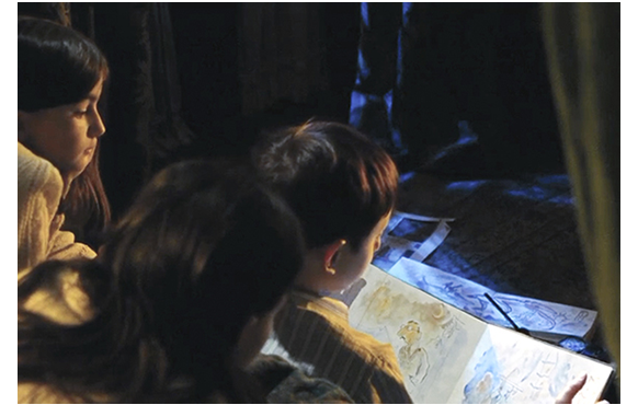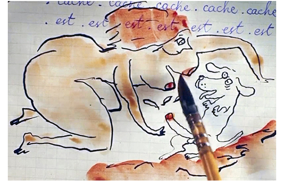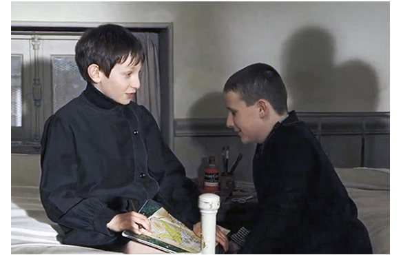 パリを偽造旅券で脱出し、リモージュへ移ったリュシヤン。入学したカトリック系の学校では、リュシヤンの描く軽妙なヌード画(1枚目の写真)が生徒たちの間で大人気に。当時は、この種のものを見る機会など皆無に近かったので、稀少な存在として重宝されたのだ。いつも危険と隣合わせのユダヤ人の少年としては、非常に心強い見方を得たことになる。「リュシヤン、ヘアをもっと濃くしろよ」。「もっとか?」。「あそこのじゃなく、わきのしたの方。好きなんだ」(2枚目の写真)。そこに教師が現れ、リュシヤンの画帳を見る。心配そうなリュシヤンだったが、「いいな。とても巧く描いてある」の言葉に安心し、「ポーレット・デュボストの裸も描けるか?」の言葉に驚いて、文字通り目が飛び出る(3枚目の写真)。