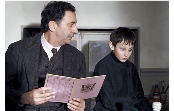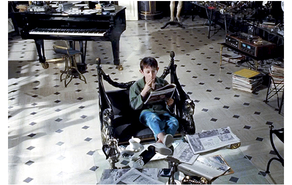 パリのギンスブルグ家。リュシヤンが父の前でピアノの練習をしている。彼にとっては、恐らく、とてもつまらないクラシックの練習曲だ。当然、熱が入らない。ミス・タッチをし、父に「どうした?」と訊かれ、「指が動かない」。「もっと上手に弾けるはずだ」(1枚目の写真)。リュシヤンは再び弾き始めるが、ミスを連発。怒った父が、「違う!」と怒鳴る。リュシヤンは小さなテーブルの下に隠れる(2枚目の写真)。指導の仕方をめぐって父母が言い争う中、リュシヤンは「ピアノは嫌いだ。音楽なんか興味ない」と父に抗議する。それでも、ピアノの前まで引っ張り出される。「なぜピアノなんか。上手く弾けっこないのに」。「弾くんだ」。リュシヤンの心のこもらない演奏に、見限って父は出て行く。