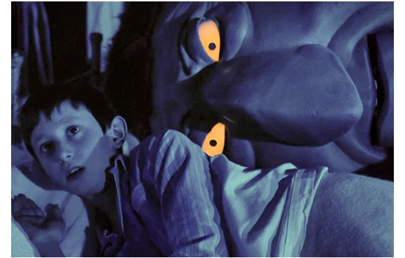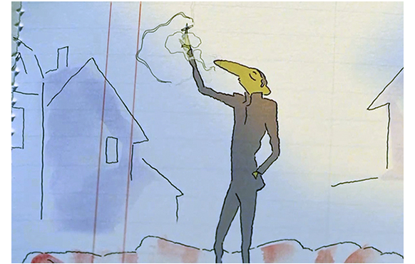 ギンスブルグ家で。リュシヤンが、双子の姉に自分の描いたバンド・デシネを見せている(1枚目の写真)。「何を描いてるの?」と訊かれ、「みんなに、『お前の顔なんか見たくない』と言われる小さなピアノ演奏者の冒険」「彼は失業してる。バーに入っても『お前の顔なんか見たくない』と叫ばれる。叫ばれるほど、彼の顔は大きくなるんだ」「自分では どうにもならない。どんどん巨大になっていき、毎日が 生き地獄になっちゃう」「逃れられないんだ。だから、ほっぺたを限界まで膨らますことにした」「そしたら、パン! 破裂した」(2枚目の写真)。「死んだの?」。「ううん、破裂した時、何か全く別のものに生まれ変わったんだ… フリピュス教授に」(3枚目の写真)。「彼は、おっかないけど、とっても優雅。だから、みんなに好かれる」(4枚目の写真)。リュシヤンの顔の前には、絵から飛び出たフリピュス教授がいて、3人の背後には、それを大きくした像が見えている。この実物大のフリピュス教授は、ハンプティダンプティに次ぐ「第二の自我」で、より積極的にリュシヤンを行動させる。「グリム童話の人食い鬼みたいに、好かれる。憎らしいけれど好きなんだ。彼がピアノを弾くと、しんと静まる」。「何を弾くの?」。「女性の好きな曲。彼は、女たらしだから」。そう、リュシヤンも幼いのに、女たらし。