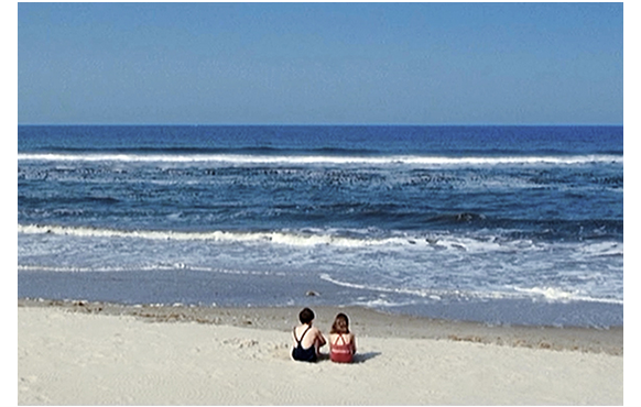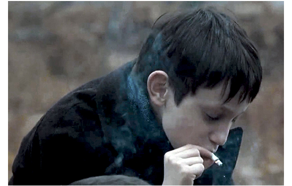 冒頭、主演者等のクレジットが出る前に、印象的な砂浜のシーンが挿入される。砂浜に仲良く座る2人の少年と少女(1枚目の写真)。少年が「手、握っていい?」と訊くと、少女は「ダメ。あんた醜いから」と言って、立ち去ってしまう。そんなに醜いのなら、そもそも一緒に座っているはずはないのだが、そこは、「醜い」というのが、この映画のシンボルともいえる言葉なので無視しよう。その後、日本発売のDVDには何故か入っていないが、2人連れのアベックが少年の背後からやって来て、前を通る時に吸っていたタバコを捨てる。その短くなったタバコを少年が口にくわえて、一服する(2枚目の写真)。その直後、スファール監督の描くゲンスブールがタバコを吸う絵に変わり(3枚目の写真)、主演男優の名前が表示される。リュシヤン少年の浜辺のシーンは、父が西海岸のカジノでピアノを演奏していたため、海岸は何度も訪れていても不思議ではないとされる。