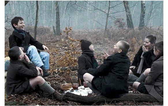リュシヤンに好意を持つ先生は、夜中にベッドまで来ると、「おい、起きろ。ドイツ兵が 明日学校を調べに来る。顔を見られたら最後だ。この斧を持って森へ行け。誰かに見られたら、樵の子で薪を集めてると言うんだ」と助けてくれる(1枚目の写真)。ゲンスブールの実体験を元にしたシーンだ。リュシヤンの背後にいるのは、ハンプティダンプティ型の自我。森では一緒に夜を過ごす。朝、生徒たちが、「食べ物を持って来た。ほら、ソーセージだ」と助けに来てくれる。これも実話。ただ、ユダヤ人はソーセージを食べない。ユダヤ人らしく暮らしてこなかったギンスブルグ家では、ソーセージを食べていたのかもしれないが。リュシヤンにとって一番嬉しかったのはタバコ。顔が煙で隠れるほど吸っている(2枚目の写真)。子供たちも同じだ。「隠れて正解だったな。ドイツ兵は ユダヤ人を徹底的に調べてた」と言う友達に、「何 話してるんだ? 僕とは無関係だぞ」と、とぼけるリュシヤン。「なら、なぜ森に隠れてる?」。「これからデートする。密会だ。行かないと。じきに彼女が来る」。「彼女?」。「ああ、そう言ったろ。デートだ。女性と」。そして、「どうやって知ったと思うんだ…」と言いかけると、生徒の一人が「だから、あそこの毛が描けたんだ」と言い、全員で笑う(3枚目の写真)。実に和気あいあいとした雰囲気だ。