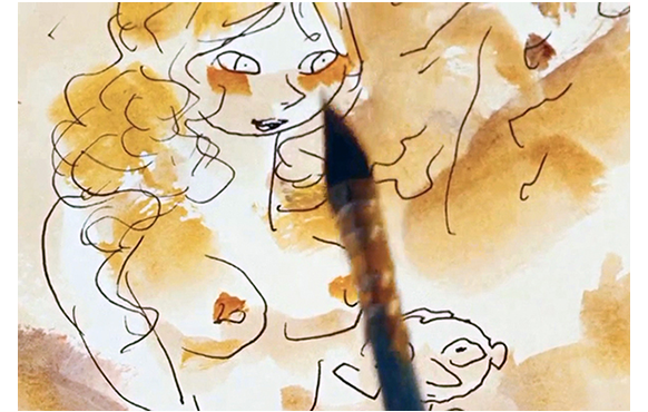 森の中で一人になったリュシヤン(1枚目の写真)。裸体画を描きながら(2枚目の写真)、パリで会ったモデルと空想で話している。「リュシヤン、寒いわ、ずっと待ってたから」。「待たせて ごめんね」。「手紙をくれないのね」。「でも、毎日 あなたを描いてる。服を脱いでもらえる?」。「もう脱いでるわ」。空想にしろ、子供とは思えない会話だ。浜辺で出会う2人。モデルに「一緒に座らない?」と手を差し伸べられ、横に座ってタバコをふかすリュシヤン(3枚目の写真)。空想はさらに広がっていく。モデル:「結婚してくれる?」。リュシヤン:「それは どうかな」。モデル:「キスしてくれる、舌を入れて?」。リュシヤン:「お望みなら。代りに、ポーズをとってくれる? お礼は払えないけど」。