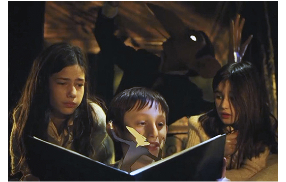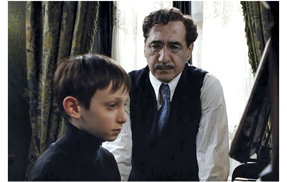 リュシヤンは、フリピュス教授と一緒にピアノを弾き始める(1枚目の写真)。リュシヤンの向こう隣に、フリピュス教授の大きくて不気味な指が見える。もちろん、教授はリュシヤンにしか見えない。彼の自我なのだから。教授と一緒に弾き始めた曲は、今までの練習曲と違い、実に生き生きとした魅力溢れる音楽だった。そのあまりの見事な音色に、耳を疑って起きてきた父。肩に手を置かれたリュシヤンは、演奏をやめる。「ごめん。すぐ寝るよ」(2枚目の写真)。「いやいや、続けて。今夜は、見事じゃないか」と父は満足そうだ。