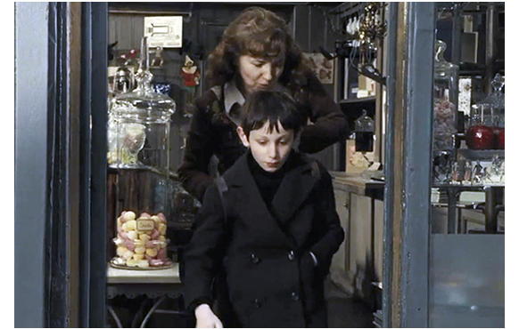 リュシヤンがお菓子や玩具を売る店に入って行く。伝記によれば、ゲンスブールは子供時代から盗みをやっていたとあるが、この場面でも、リュシヤンは、さっき母に頼んで拒否された拳銃のオモチャをこっそり盗む。その後で、女店主に「何してるのよ?」と詰問され、「見てるだけ」。「見てたんじゃない。汚い手で触ってた」と罵られる。どうやら、女店主は、リュシヤンがユダヤ人であることを知っていて、店にいて欲しくないのだ。「出ておいき!」(2枚目の写真)と、突き飛ばすように追い出される。日本版では、前のシーンがカットされているので、なぜリュシヤンが拳銃を盗むのかが分からない。