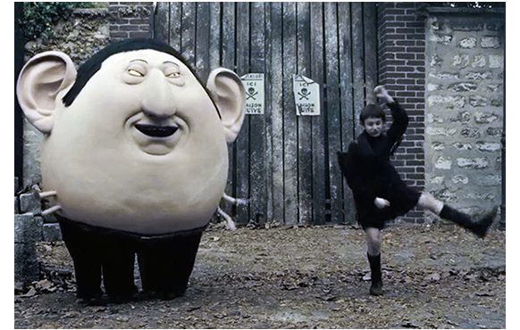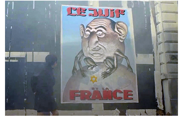 追い出されはしたものの、目的の拳銃が手に入り上機嫌のリュシヤン。向こうから国歌「ラ・マルセイエーズ」を歌いながら自警団のような連中がやってくる。彼らが行った後、国歌の中で一番激しい「Qu'un sang impur(汚れた血が)」の部分を大声で歌うリュシヤン。すると目の前に、「ユダヤ人とフランス」と書かれたポスターが貼ってあった。ハンプティダンプティを鷲鼻にしたような絵が、ダビデの星とともに描かれている(1枚目の写真)。ポスターの前を通り過ぎると、リュシヤンの空想の中で、ポスターから抜け出したハンプティダンプティが後を追ってくる。逃げても、逃げてもだ。しかし、よく見るとハンプティダンプティは、友好的だ。そこで、リュシヤンは一緒に踊る(2枚目の写真)。このハンプティダンプティは、映画では、少年期の時だけ現れる「第二の自我」。自己防衛の表象であろう。なぜかと言うと、時は1942年6月6日。親独政策をとるヴィシー政権が、6歳以上のすべてのユダヤ人に対して黄色の星を胸に取り付けるよう命令を出した日だ。