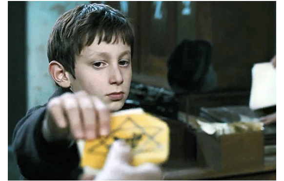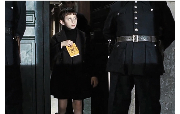 リュシヤンは、黄色い星の頒布日、朝一番に警察に行く。担当者が、朝、頒布室に入って行くと、リュシヤンが警官のタバコに火を点けている。「ご立派だな、ブロショー。勤務中に喫煙。しかも、子供の前で」と冷やかす。「でも、この子がタバコをくれたんですよ」。「開場前に、ここで何しとるんだ?」。「この子が、星が欲しいと」。そう言って、係員が「黄色い星」をリュシヤンに渡す(1枚目の写真)。「どうもありがとう。こんな日に遅れると、一生の恥になりますから」。最高の皮肉だ。当然、上司は怒る。「お前、何様のつもりだ?」。「僕は、リュシヤン・ギンスブルグ。ユダヤ人です。父は、ナイトクラブのピアノ弾きです」。「なぜ、そんなに早く付けたがる?」。「あなた方でしょ。僕らに付けたがっているのは」(2枚目の写真)。伝記の会話と若干違っている(解説参照)。「無礼千万な奴だ。なぜ 学校にいない?」。「学校はやめました。モンマルトルの絵画アカデミーにいます」。「モンマルトルの絵画アカデミーだと? もし、そこがお前のようなクズを入れてるのなら、ロクな所じゃないな」。「そんなこと 言ってはダメですよ。アカデミーには、立派な人も来てますから。例えば、SSのカール・ハインツ中尉とは、同じクラスです。中尉さんは僕が好きで、お菓子もくれました」。「何が言いたい?」。「紹介しましょうか? 出世に役立つと思いますよ」。生意気な言動に逮捕されなかったのは、SSと親しいという話を信じたからか? リュシヤンは、胸に黄色い星を掲げ、警察署を出る(3枚目の写真)。そこには、ユダヤ人の長い列が出来ていた。リュシヤンは、注目を一身に浴びながら列の脇を歩いて行く(4枚目の写真)。なお、ゲンスブールは、黄色い星を付けさせられたことを、「雄牛が、焼きゴテで烙印を押されるようなもの」とも語っており、如何に屈辱だと感じていたかがよく分かる。