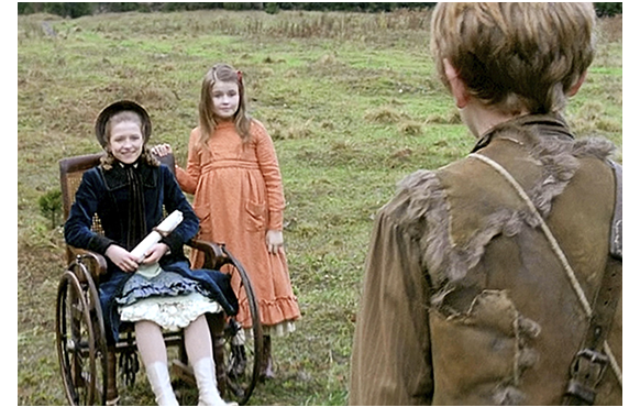 この日を境に、ペーターの様子がおかしくなる。それは、今まで独占してきたハイジを盗られてしまったからだ。ペーターは、テーブルの様子を草むらの中から伺っている(1枚目の写真)。そして、放牧地に山羊を連れて行く必要があるので、渋々姿を現す。それを見つけたハイジが、さっそくクララに「会わないと、クララ。お土産を渡せるわ」と言って、車椅子を押していく。反抗的に下を向いたままのペーターを前に、ハイジが「お友達のクララよ」と紹介し(2枚目の写真)、クララも「今日は、ペーター」と微笑むが、ペーターは作り笑いで「やあ」と言っただけ。クララが「これ、あなたに」とお土産を渡すが、何も言わずに受け取る。ハイジが「フランクフルトから持ってきたの」と説明すると、あまり嬉しそうな顔でなく「ありがとう」。ハイジは、さらに、「あなたのおばあちゃんには暖かなショール、お母さんにも服を持ってきたのよ」と付け加えると、「そうかい(Oh yeah)?」(3枚目の写真)。そして、背を向けて山羊を連れて行く。どう見ても、失礼な態度だ。クララは、「なぜ、嫌われるの?」と悲しそうにハイジに訊く。「妬んでるんだと思うわ。今まで毎日一緒に放牧地に行ったけど、ここ数日、できなかったから」。