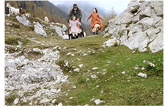 クララの「いつか、放牧地に行きたいわ」という希望は、アルムおじさんがクララの車椅子を押して登ることで実現した。高台に来て至極満足げなクララ(1枚目の写真)。ハイジに「山は好き?」と訊かれ、「ええ、素晴らしいわね」。アルムおじさんがクララの腰に手を回して、持ち上げるとピクニックをするため草地に運んでいく。それを岩陰からこっそり見ていたペーターは(2枚目の写真、後ろめたそうな表情がいい)、2人がいなくなると車椅子に寄って行き(3枚目の写真)、後ろから思い切り蹴飛ばす。車椅子はそのまま草の斜面を自走して行くと、崖から垂直に落下し、こなごなになった。