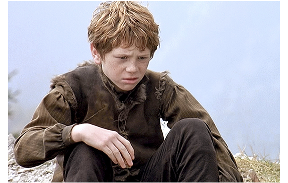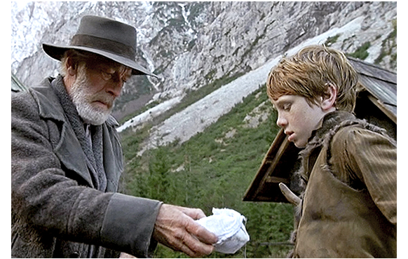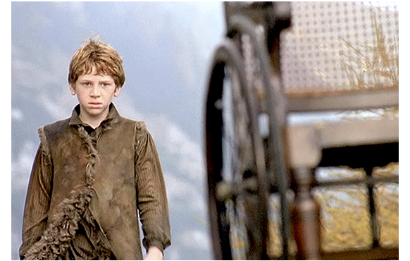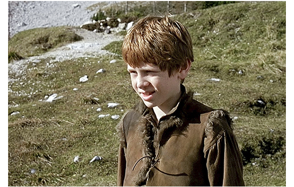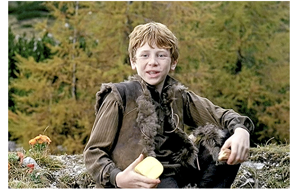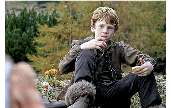サム・フレンド(Sam Friend)がペーター役を演じる2005年版「ハイジ」。イギリス制作で、会話は英語だが、恐らく原作に最も忠実な作品。「恐らく」と書いたのは、たくさんある「ハイジ」をすべて観た訳ではないからだ。ペーターは脇役なので、この紹介、特に、あらすじはペーターの登場する場面に限定する。しかし、解説の部分では、原作との対比について触れておこう。初めに原作に忠実と書いたが、原作からの逸脱箇所は、時間の関係で削除された部分を除くと、①ハイジがフランクフルトから帰ってきた時のアルムおじさんの態度が厳しすぎる、②ペーターがクララの車椅子を突き落とす場所、きっかけ、その後のクララの歩くきっかけが違う、の2点だけで、後は、登場人物の外見・性格付けを含め、きわめて原作に近い。例えば、最近作の2014年版「ハイジ」では、逸脱箇所は、①冒頭のデーテとハイジの山を登る状況が違う、②残されたハイジに対するアルムおじさんの対応が冷た過ぎる、③最初のアルプ行きでハイジの昼食をペーターが勝手に食べる(連れている山羊も多すぎる)、④デーテによるハイジの「誘拐」の仕方が違う、⑤フランクフルトで最初の夕食の状況が全く異なる、⑥ハイジがアルプス見たさに教会に行く時クララを同行し、捨て猫をもらうのはハイジでなくクララ、⑦クララの父と祖母が同時に帰宅、⑦ハイジに対する祖母のアルファベット教育と夢遊病が同時進行、⑧ハイジの帰郷を聞かされたクララの反応がハイジに冷た過ぎる、⑨クララと祖母が山小屋を唐突に訪れる、⑩藁の寝床で、ハイジがクララに藁をかけてふざける(不健康なクララにそんなことをするとは思えない!)、⑪クララに突然会い来た父親が娘の姿が見えないと怒り出す、⑫クララの医者がアルプスに来ず、最後が尻切れトンボ、等々多い上に、(a)寡黙なはずのペーターがしゃべりすぎ、(b)優しいだけのクララに生意気で冷たい側面がある、など主要登場人物に「あれ」と思わせる違いもある。下に、1枚写真を付けるが、ハイジは歴代で一番「らしい」が、ペーターは一番「醜い」。それに比べると、2004年版「ハイジ」の登場人物は、アニメの「アルプスの少女ハイジ」に近い。ハイジはそれほど可愛くないが健康そのもの、ペーターは歴代で一番ハンサムだろう。そして、アルムおじさんを演じるのは、あのマックス・フォン・シドー、いけ好かないロッテマイヤーはジェラルディン・チャップリン、ハイジの後見人となる医者は著名なシェイクスピア俳優のオリヴァ・フォード・デイヴィス。演技者の層は一番厚いのではないか。