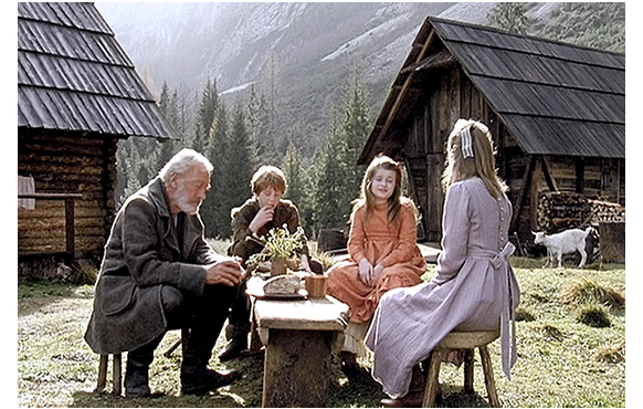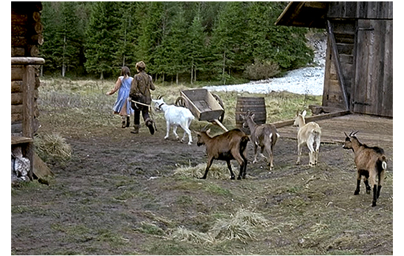 ハイジが、アルムおじさん(祖父)の山小屋にやってきた次の日の早朝、小屋の前につないである2頭の山羊を見て、「この子たち何て名前?」と祖父に訊く。映画では「こっちは『Daisy(雛菊)』、これは『Dusky(こげ茶)』」と答えるが、原作では『Die Weiße heißt Schwänli(小さな白鳥) und die Braune Bärli(小熊)』〔1881年の初版本(https://archive.org/details/spyhdlr)〕となっている。その時、口笛の音がして、ペーターが村人の山羊を連れてやって来る。祖父:「ペーターじゃ。放牧地まで 山羊を連れに来たんじゃ」。ハイジ:「行ってもいい?」。「構わんが、まず顔を洗ったらどうじゃ? お日さまに笑われれずにすむぞ」。アルムおじさんは、ペーターには、「お前さんにも異存はないな(Presumably you have no objections)、山羊大将?」と訊く。怖いアルムおじさんの「命令」なので、ペーターには背く気などない。それでも人見知りする少年らしく嬉しそうな顔をしないところがとてもいい(1枚目の写真)。「いいけど(Suppose not)」。アルムおじさんは、「あの子のお昼だ。全部食べさせろ」と白い包みを渡す(2枚目の写真)。ハイジはペーターと一緒に、牧草地に向かって歩き出す(3枚目の写真)。