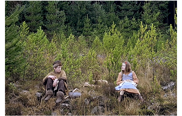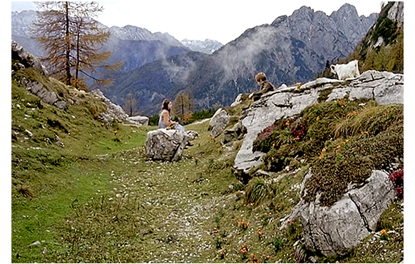 別の日、ハイジはペーターと一緒に山へ出かける。「すぐ雪がくるな」。「どうして分かるの?」。「そんな気がする」。そして、話題を変えて、「僕のばあちゃんが、君に会いたいって言ってる」(1枚目の写真)と訊く。「どんな人?」。「すごい年寄りで、目が見えない。代わりに指で触るんだ」。「ほんと? どうやるのか見たいな」。「じゃあ、明日はどう?」(2枚目の写真)。「いいわよ」。