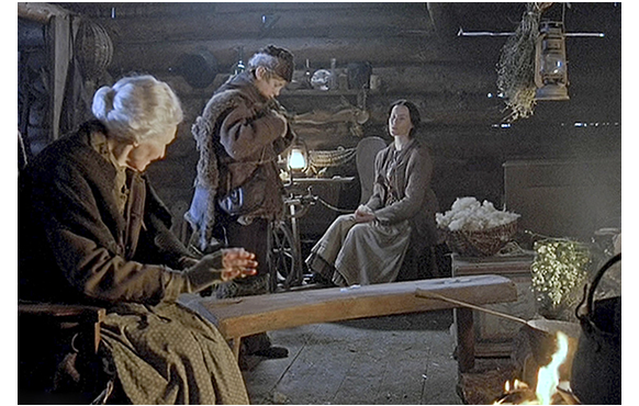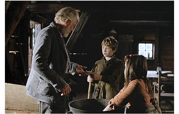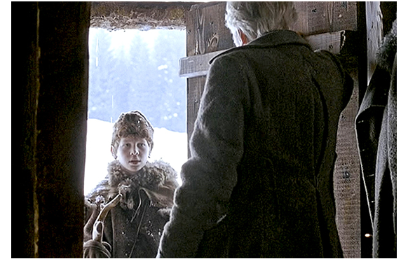 次の日は、ペーターが言った通り、一面の雪。ハイジは、それを見て、「ペーターは、どうやって羊を連れてくるのかな?」と祖父に訊く。「できないじゃろうな」。「でも、おばあちゃんに会うって約束しちゃった。私を待ってるわ」。「婆さんも、我慢するしかないじゃろうて。お前もだぞ」。しかし、ペーターは歩きにくい新雪にもかかわらず、出かける用意をしている。「どこへ行くの?」。「ハイジに会いに」(1枚目の写真)。「雪が深すぎるわ、ペーター」。「心配ない。僕なら平気さ。暗くなる前に帰るよ」。ペーターは雪こぎをして、ハイジの山小屋まで登って行く。誰かがノックするので、ドアを開けたアルムおじさんは、「ペーター!」とびっくり(2枚目の写真)。「気は確かか? 雪が固まる前に登ってくるなんて」。ペーターは、「ちゃんと来たろ?」と言って小屋に入ると、「やあ、ハイジ」と挨拶する。すごく仲のよい雰囲気だ。せっかくペーターが来たので、アルムおじさんは、食事を用意してやる。「それで、大将… また、鉛筆をかじるつもりかな?」。ハイジは、何の意味か分からないので、「鉛筆をかじるって?」と訊く。「冬の間、ペーターは学校に行かなゃならん。そこで、鉛筆かじりに、生き甲斐を見出した訳じゃ。違うか、ペーター?」と皮肉たっぷりに訊く。ペーターが好きなハイジは、もっと単純に「学校で何するの、ペーター?」と尋ねる。「読み書きを習うんだ。僕は、一度もやったことないけど」。「どうして?」。「時間のムダだからさ。山羊飼いに、読み書きなんか必要ないだろ」。それを聞いたアルムおじさんが、諭すように言う。「さてさて、それは、場合によりけりじゃ。一生山羊飼いとして暮らしていきたければ別じゃがな」(3枚目の写真)。居づらくなったペーターは、「帰らないと」と言って席を立つ。
