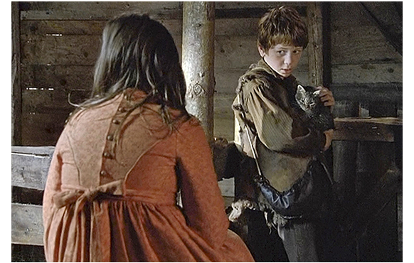 フランクフルトで暮らしていて、アルプスが恋しいあまり夢遊病になったハイジは、祖父の元に帰される。帰ってきた日は、山小屋に入れてもらえず〔原作との乖離点①〕、隣の山羊小屋で藁にくるまって寝る。あくる日、ペーターがやってきて、山小屋の前で薪割りをしているアルムおじさんに「ハイジ、どこ?」と訊くが、返ってきたの「知らんな(How should I know?)」というすげない言葉。その時、山羊小屋から「ここよ、ペーター」とハイジが呼ぶ。さっそく中に入って行ったペーターに、ハイジはフランクフルトから連れてきた子猫を見せる。猫を抱いたペーターは、「何て名前?」と訊く(1枚目の写真)。「ボリスよ、すっごく大胆なの」。「それで、放牧地へは来るかい?」。「やめておく(I don't think so)」。「あの気難し屋と ここにいる方が楽しいもんな」。「そんな言い方しないで。私が出てって、おじいさん、すごく傷付いたんだから」。「出てけって 言われたんだろ?」。「腹を立ててたからよ。叔母さんなんかと 行くべきじゃなかった」。「あいつに 駅まで引きずってかれたんじゃないか」(2枚目の写真)「僕、見てたんだぞ」。この言葉を漏れ聞いていた祖父は、その後、ハイジに対する怒りを静めていく。コメント: 祖父のハイジに対する怒りが強過ぎるように感じる。しかし、原作のように大歓迎というのもしっくり来ない。ハイジとペーターのこのシーンは、それなりに現実的で、映画の中にうまく溶け込んでいる。2枚目の写真のペーターの表情も、他では見たことがないので、とてもいい。