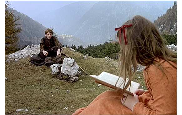 祖父と仲直りしてから何日も経ち、季節は秋に。放牧地に来ても、ハイジは本を読んでばかりいる(1枚目の写真)。「フランクフルトから戻ってきてからずっと、バカな本ばかり読んでるな」。「本はバカじゃないわ、ペーター」。「読む奴がバカなんだ」。「あなたも読み方を覚えるべきよ。私が教えてあげる」。「いいよ」(2枚目の写真)。「じゃあ、どうなるか、分かってるの? 分からないでしょ?」。「何をさ?」。「いつか、山高帽をかぶってるような先生のいる大きな学校に行かされた時、読めないことがバレたら、みんなに からかわれるんだから」。「するもんか」。「するわよ、絶対」。「ほんとに、読み方 教えられるの?」(3枚目の写真)。「もちろん」。かくして、ペーターはハイジから読み方を習うことに。