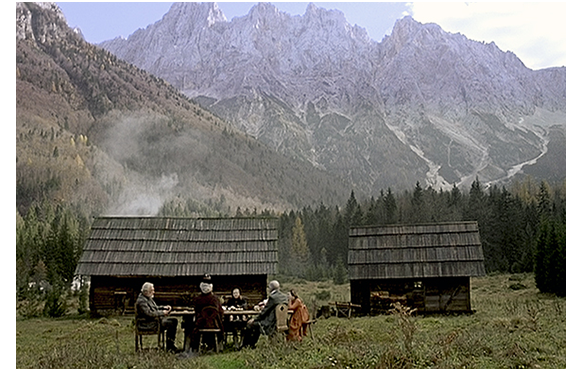 そんなある日、フランクフルトから届いた手紙をペーターが届けにくる(1枚目の写真)〔アルムおじさんに手紙を渡すのは、宛先の「ハイジ」という字が読めないから〕。祖父は、「お前さんにだ。フランクフルトから」と言って(2枚目の写真)、手紙をハイジに渡す。ハイジがびっくりするところで画面はフルンクフルトに変わるが、手紙にはクララと祖母と医者がハイジの元を訪れると書いてあった。そして、実際に山小屋までやって来た3人。アルムおじさんはテーブルを家の外にしつらえ、素朴だが新鮮な食事でもてなす(3枚目の写真)〔小屋から出すにはテーブルを分解しないと無理なので、大変な歓待だ〕。この場で、おじさんは、クララが望むなら、夏中ここに泊まればいいと勧める。
