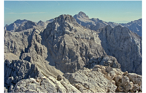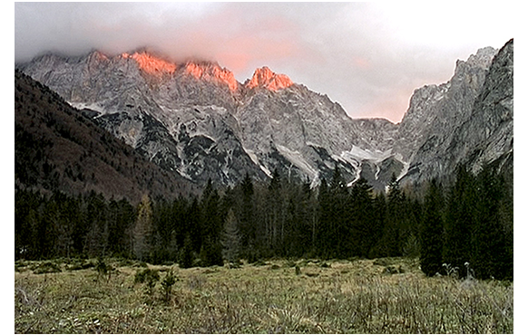 管理者の特権で、少し違う話をしよう。「ハイジ」はあまりにも有名なので、内容に言及しても仕方がないからだ。「ハイジ」の舞台はスイス北東部のマイエンフェルト(Maienfeld)からリヒテンシュタインの方向に入っていった山中。私もマイエンフェルトには行ったあるが、「雰囲気のなさ」にがっかりしたものだ。2014年版「ハイジ」は、その南方のクルヴァルデン(Churwalden)がロケ地になっている。サン・モリッツからクール(Chur)へと抜ける主要幹線沿いの町だ。映画では、秋の紅葉ならぬ「黄葉」が美しいが、私が近くのマルモレラ湖で撮影した素晴らしい「黄葉」の写真を最初に付けよう。ところで、ヨーロッパアルプスはフランスからスロベニアまで続いているが、地質上は西が片麻岩と結晶片岩、中央が片麻岩と結晶片岩、東が苦灰石からなっている。西の代表はフランス・シャモニー付近の黒く荒々しい針峰、中央はスイス~オーストリアに広がる灰色っぽい重量感のある山容。マイエンフェルトやクルヴァルデンのアルプスもこの部類だ。それがイタリアに入ると一変し、白く垂直の岩肌のアルプスに豹変する。2005年版「ハイジ」のロケ地はスロベニアのアルプス。イタリアと同じ白いアルプスだ。だから、山の雰囲気がスイスとは全く違う。映画の中でハイジが見とれるバラ色に染まったアルプスの写真を2枚目の付ける。白いのは雪のせいだけではなく、苦灰石のせいだ。私はアルプス歩きが好きで、スロベニア・アルプスにも行ったことがある。その時の縦走ルートを3枚目の写真に赤で示す(目的地は左端のPrisojnik山)。岩の色が2枚目の写真に似ていることが分かる。4枚目の写真は山頂からの大展望。標高は高くないが、堂々とした山並みだ。