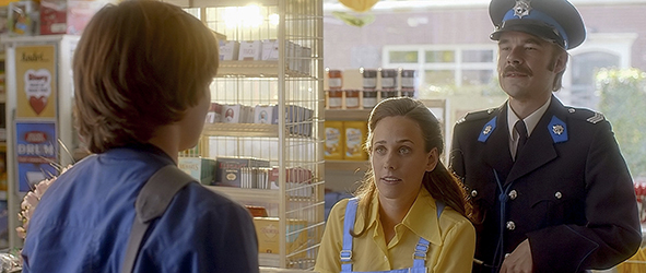 自宅に帰ったバートが居間でTVの買い物番組を観ていると、父が、「台湾製や日本製のがらくた」と悪口を言うシーンがある。1979年には、日本製はもう「ガラクタ」ではなかったし、台湾製はまだ進出していなかったので、これはお粗末な脚本が悪い。そして、この偏見に満ちた父は、ボスがこうした「がらくた」を取り扱いたがっていて、自分はそれを拒否したと自慢げに話す〔それが原因で、後でクビになる〕。父は、ビデオ店についても批判する。「誰が、ビデオなんか借りに行く。すぐにタダでTVで見られるのに」。旧弊なだけの敗残者だ。母は、「シェフ〔兄の神父〕の話じゃ、教会にも来ないそうよ」と批判する。こちらは、信仰のことしか頭にないガチガチ女。最悪の両親だ。父:「レンタルなんて! 3ヶ月でつぶれちまうぞ」。バートが、「僕、女の子と話したよ。とっても素敵だった」と割り込むと、父と母も心配になって居間に来る。母:「私は反対よ」、父:「その通りだ」(1枚目の写真)。母:「ああいう連中と付き合っちゃダメ」。2人は、心も貧しい。バート:「イエス様は、罪人とだって話されたよ」(2枚目の写真)。母:「いつから。イエス様になったの? うぬぼれるんじゃないの。大罪よ」。バートは、翌日、もう一度コンビニに行く。レジに行き、「僕の友達が…」と、言いにくそうに始めたところで、顔見知りの警官が、「手を上げて、パンツを下げろ」とピストルを向けて、冗談で脅す。そして、「欲しいものをさっさと言って、出てくんだ」とバートを急がせる〔警官は、女店主といい仲なので、バートが邪魔〕。「何かご用?」。「僕の友達が、払うのを忘れたんです。ラングのキャンディー1本と、スティムローのガム2個と、チョコバー3本を。僕が払いに来ました」。警官は、当然、怪しみ、「友達の名前は?」と尋ねる(3枚目の写真)。「ベルギーから来たビデオ店の子です」。「バカな悪ふざけは 二度とやるなと言っとけ」。バートは支払った後、モニク用にタバコを2箱買う。バートは木の礼拝堂に行くと、タバコを買ったことを、「僕、心から彼女を助けたいのです。あの一家を教会に連れて行ければと思います」と正当化する。
