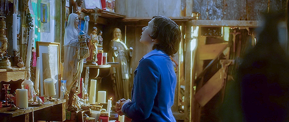 時代は1979年。場所は、オランダの架空の田舎町。バートは朝起きると、服を着て、ベッドも整えた後で、窓辺に跪(ひざまず)いて唱え始める。「お早う、イエス様。お早う、マリア様。お早う、天使たち。パパとママとシェフ伯父さんと僕が、水難や火難に遭いませんように」(1枚目の写真)。ここで、独白の形で、バートがイエスに話しかける。「これから、ママとパパを起こします… 食器はもう洗いました… 今度は洗車です」。バートは、小さな木の箱のバイク・トレイラーを牽いて自転車で家を出る。途中で、「ハーマン家の一番下の子に自転車の乗り方を教えました」。自転車はさらに先へ。「シェフ伯父さんの買い物もしました」。バートは、箱一杯の野菜類を伯父〔神父〕に渡す(2枚目の写真)。伯父は、「ママによろしくな」と言う〔母の兄〕。「僕とあなたの礼拝堂もちゃんと進んでいます」。バートは、自分のツリーハウスとして、拾ってきた板で教会のようなものを作っている。バートは、その“礼拝堂”の中に設けたきらびやかな“祭壇”の前で祈る(3枚目の写真)。