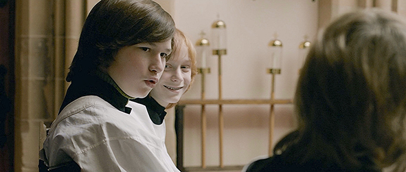 バートは、そのまま町の教会に向かう〔撮影に使われたのはSt.Odliënberg教会〕。「好きだから、良いことなら何でもします。だから、グリース・バッジを捜すのを手伝って下さいますよね?」。グリース・バッジとは、1978年に封切られた学園ミュージカル映画『グリース』に因んだ丸いバッジのこと。バートは、教会に入ると、侍者の真っ白なアルバ〔チュニック〕を身にまとう。「それに、数学のテストでも いい点が取れたらなと思います」。最後の2つの願いは 少し打算的ではあるが、信仰心が篤いことは確か。これは、神父を兄に持つ母の強い影響だ。教会では、初聖体拝領式が行われている(1枚目の写真)。それを侍者として、シェフ神父の横に立って見ているバートは、「何て美しいのでしょう。地上の天国ですね」と 主に語りかける〔映画の題名〕。式が終ると、4人の侍者は控え室に入る。ウィリーは、さっそく棚からミサに使う白ワインを取り出し、ラッパ飲み。バートは、「そんなことしちゃダメだ」と止める。ウィリーは、「まだ、残ってるぞ、飲めよ」とビンを差し出す(2枚目の写真)。真面目なバートは、「いらない。棚に戻すんだ」と言うが、ウィリーは「アホが」と言って、もう1回ラッパ飲みをする。ただ、急いで飲んだので思わず咳き込んでしまい、ちょうど入って来た神父に、「どうした?」と訊かれる。「テントウムシが喉に入りました、神父様」〔英語字幕ではハエになっている〕。神父は、バートに、「ウィリーの話は本当か?」と尋ねる。「君が本当だと言えば、本当に違いない」。普通なら、友達を庇うものだが、バートは、「ウィリーは、ワインにむせました」とバラしてしまう。ウィリーは、主の祈りを5回、アヴェ・マリアの祈りを10回唱える罰を食らい、バートを睨む。神父(伯父)は、「勇気があるなバート。主もお忘れにならないぞ」と褒める。バートが教会の外に出ると、隣に停めてあった自転車のタイヤにグリース・バッジを見つけてにっこりする(3枚目の写真)。神様からのご褒美だ。